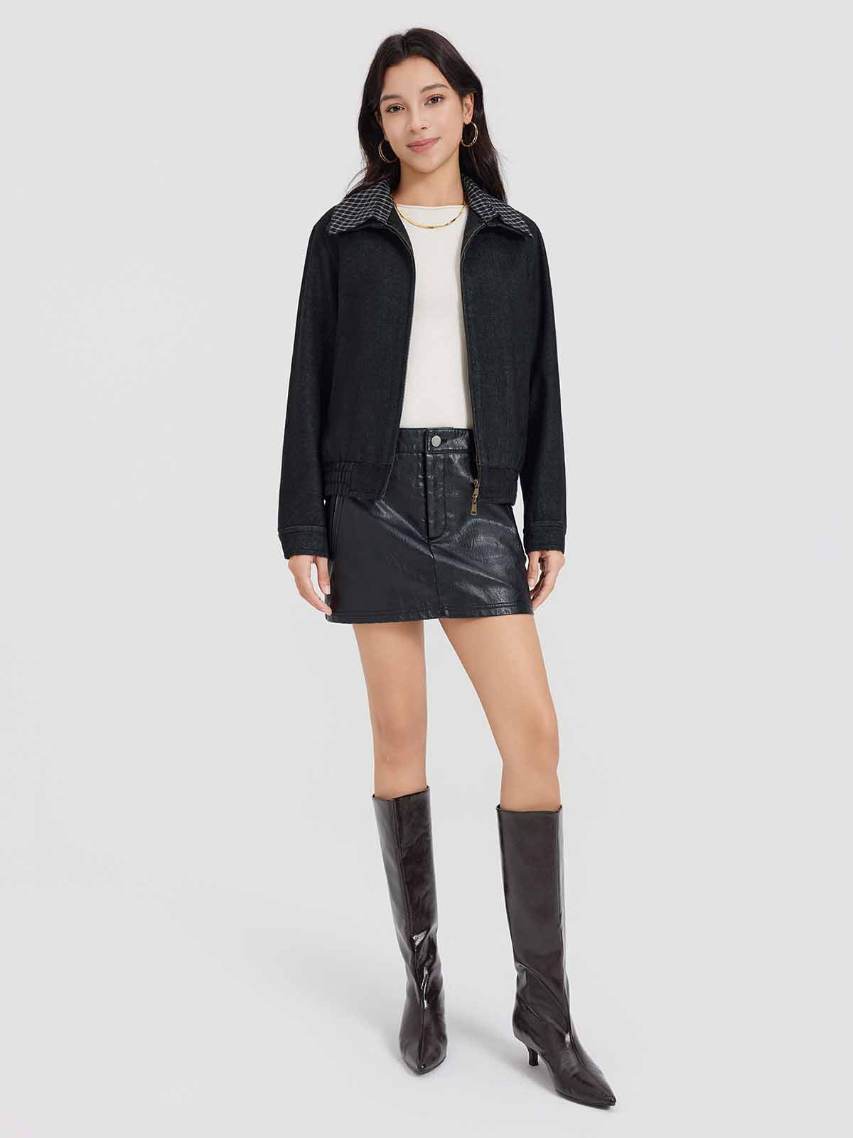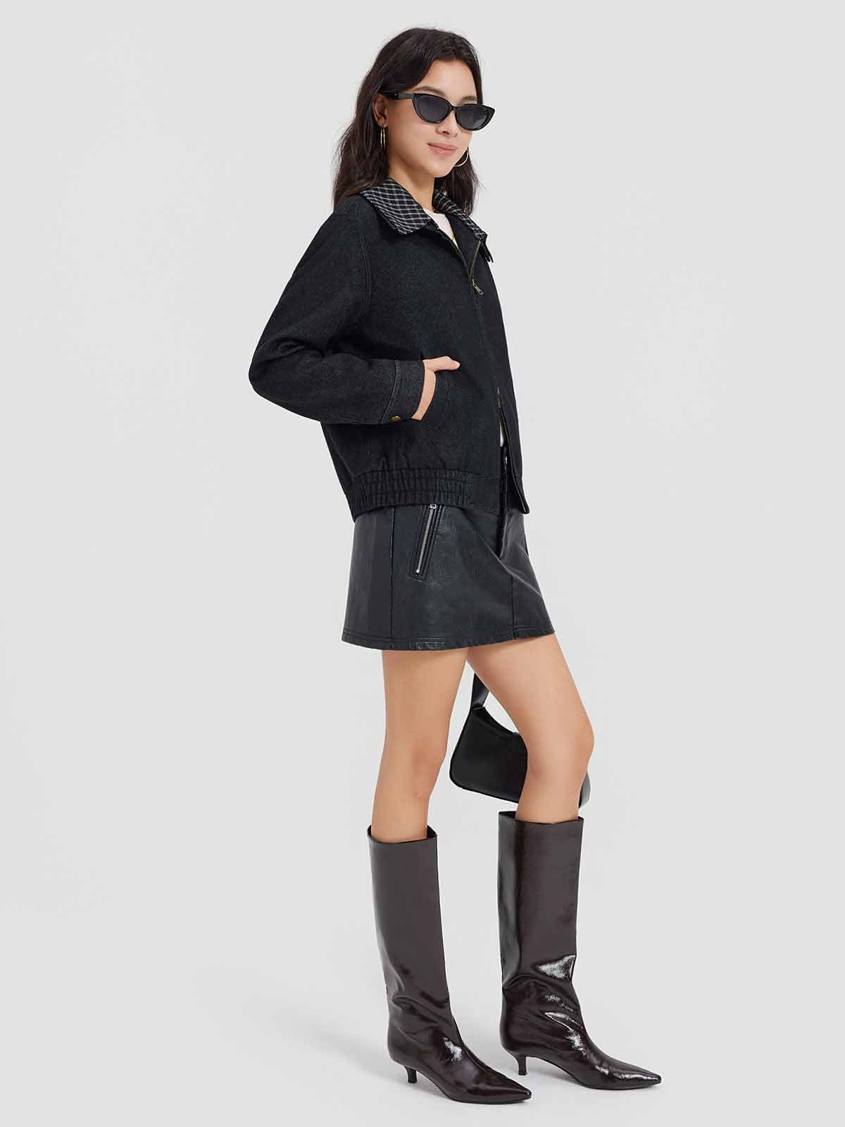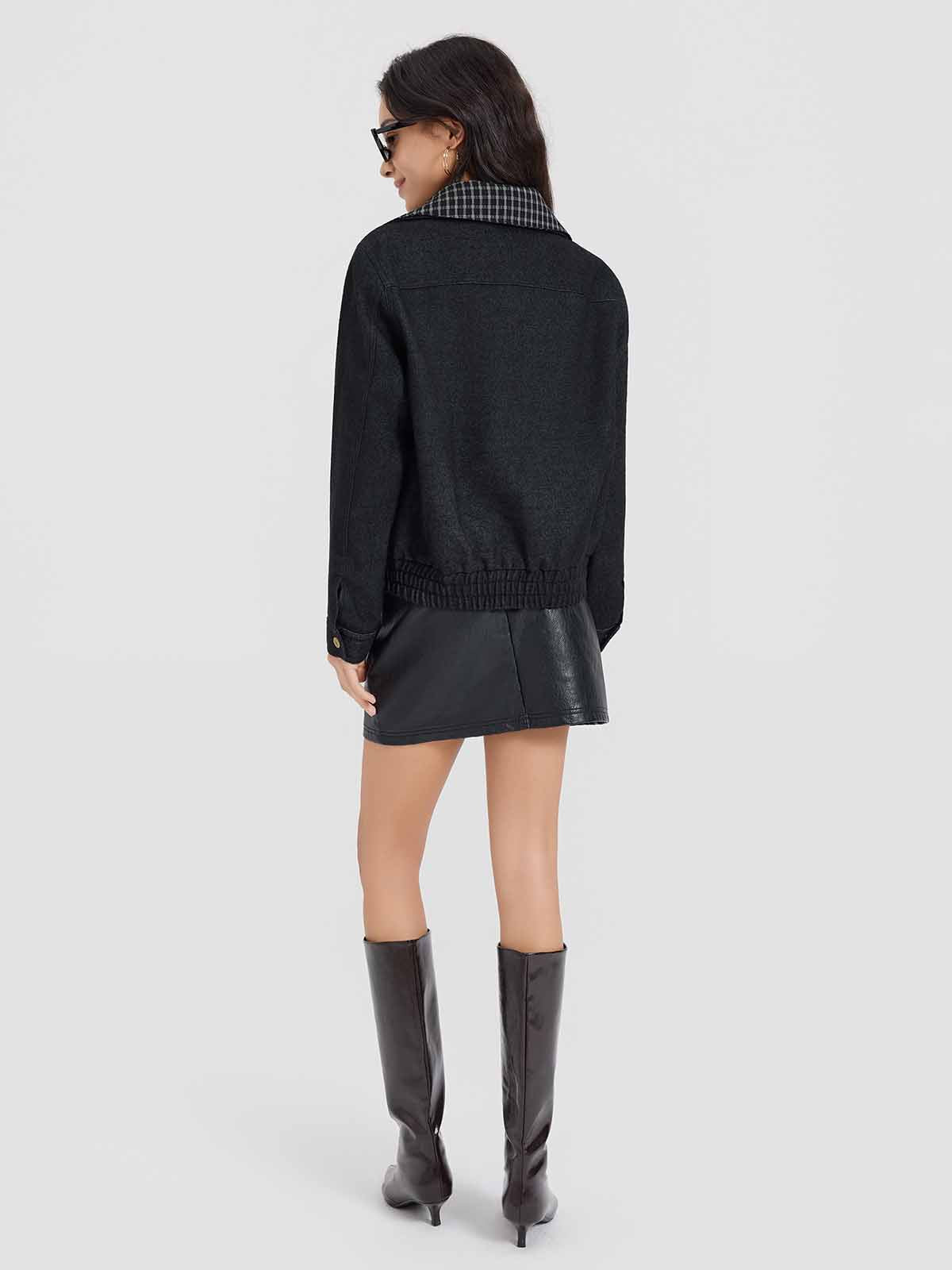 This relaxed-fit trucker jacket features a classic collar with removable contrast check lining, zip-front closure, patch pockets with topstitch detailing, metal-buttoned cuffs, and a subtly cinched hem for a flattering silhouette. Crafted from structured wool-blend denim for vintage-inspired texture and warmth.