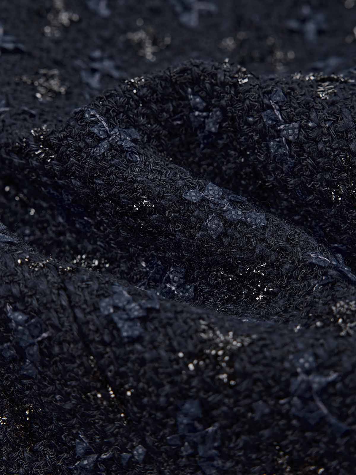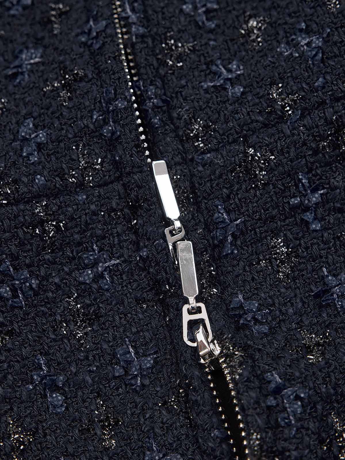 This tweed mini dress features a round neckline, front zip closure, and multiple pockets trimmed with white braided detail. Woven with subtle blue and gold threads, the textured tweed offers a refined, structured look that transitions effortlessly from day to night.