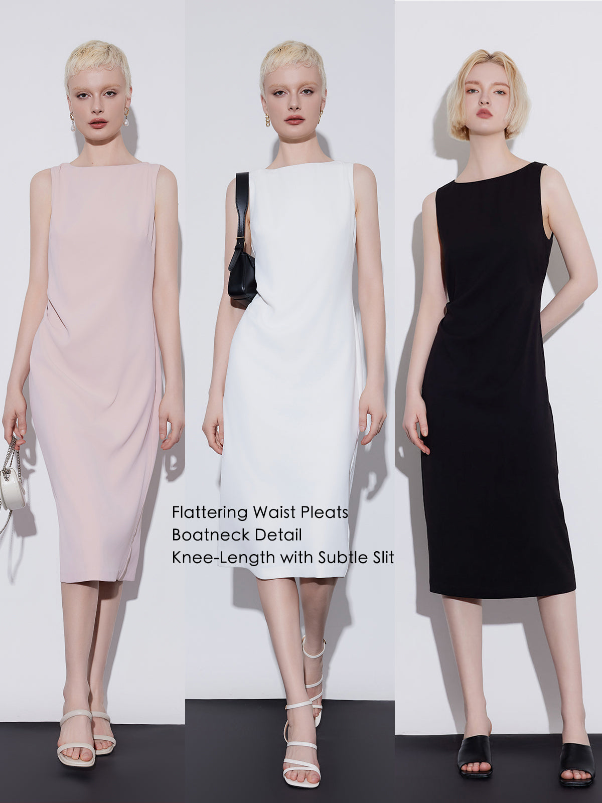 This elegant knee-length dress features natural waist pleats that beautifully accentuate your curves. The boatneck enhances your neckline visually. With just the right amount of sleeveless design, slit hem, and knee-length cut, it exudes elegance. Crafted with a hint of stretch for comfort without constriction, allowing you to move freely.