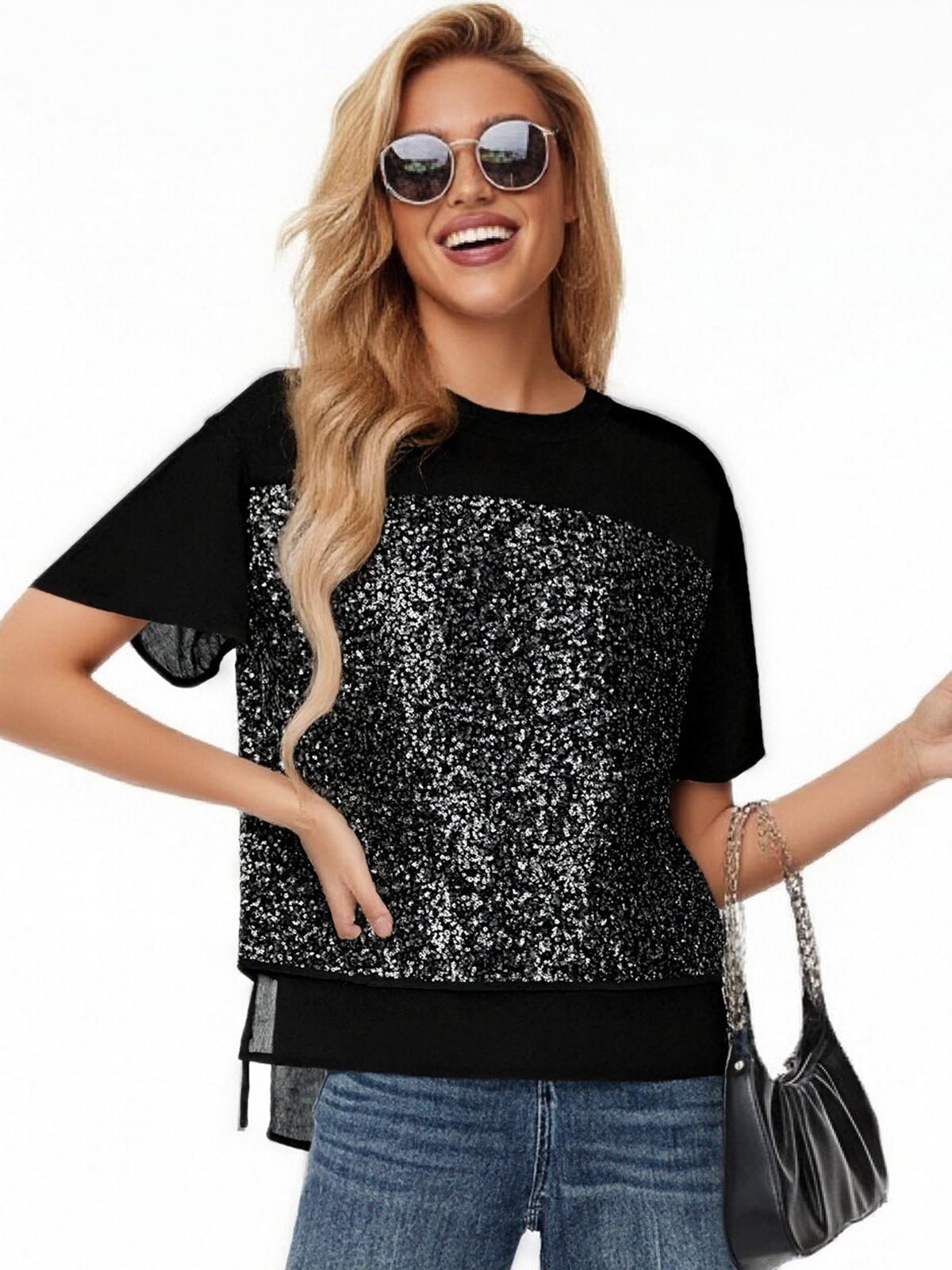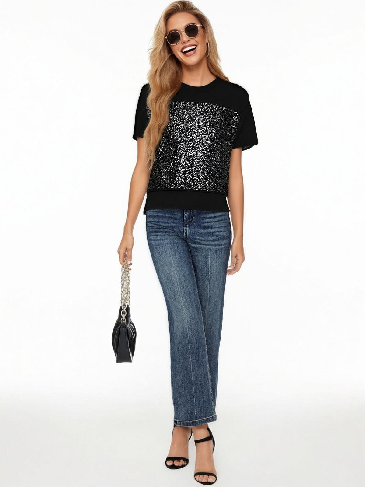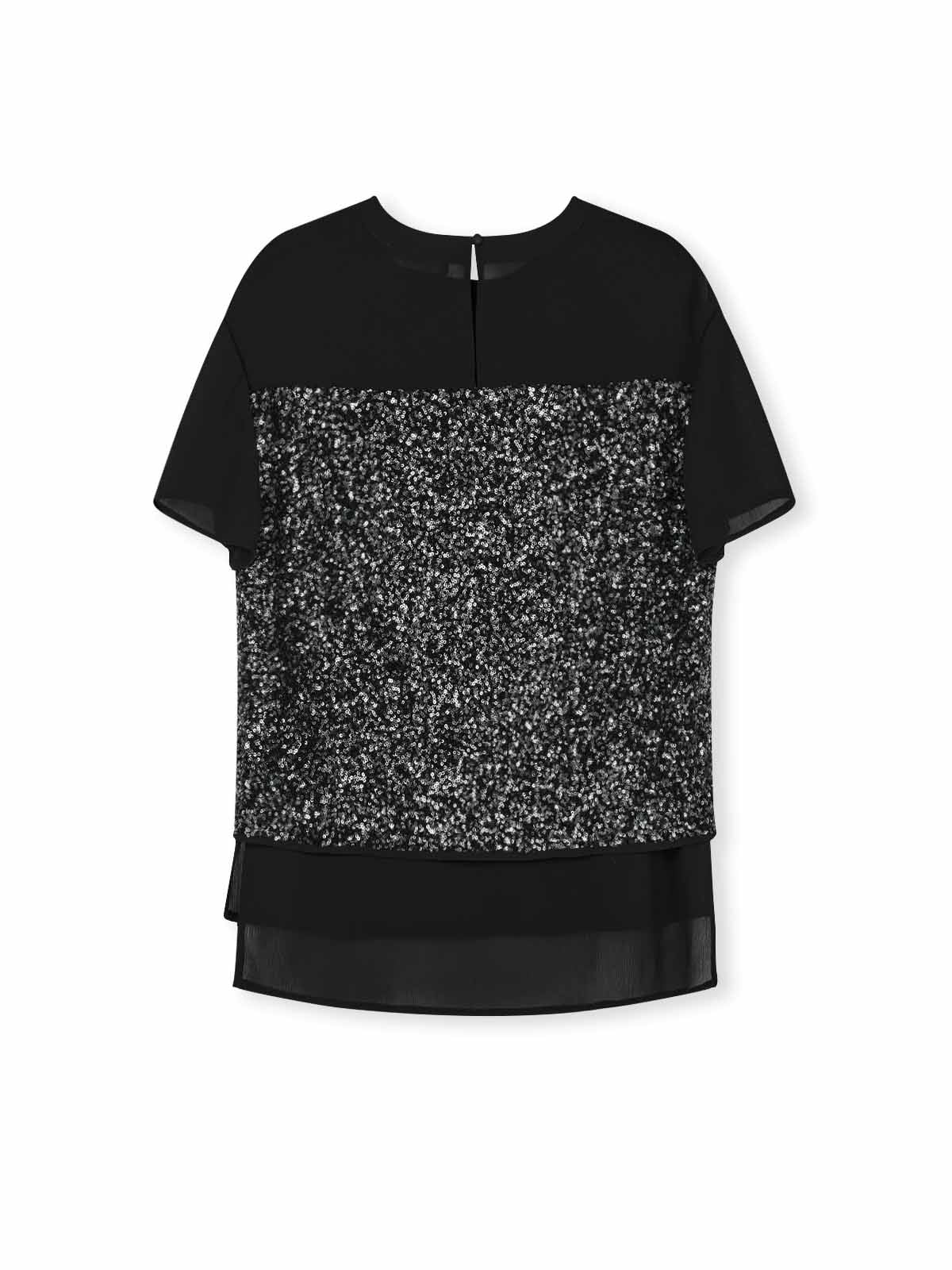 This short-sleeve top pairs metallic sequins with airy chiffon for a dimensional, light-balancing finish. It’s designed with a relaxed crew neckline and concentrated sequin placement that draws the eye without feeling overdone.
