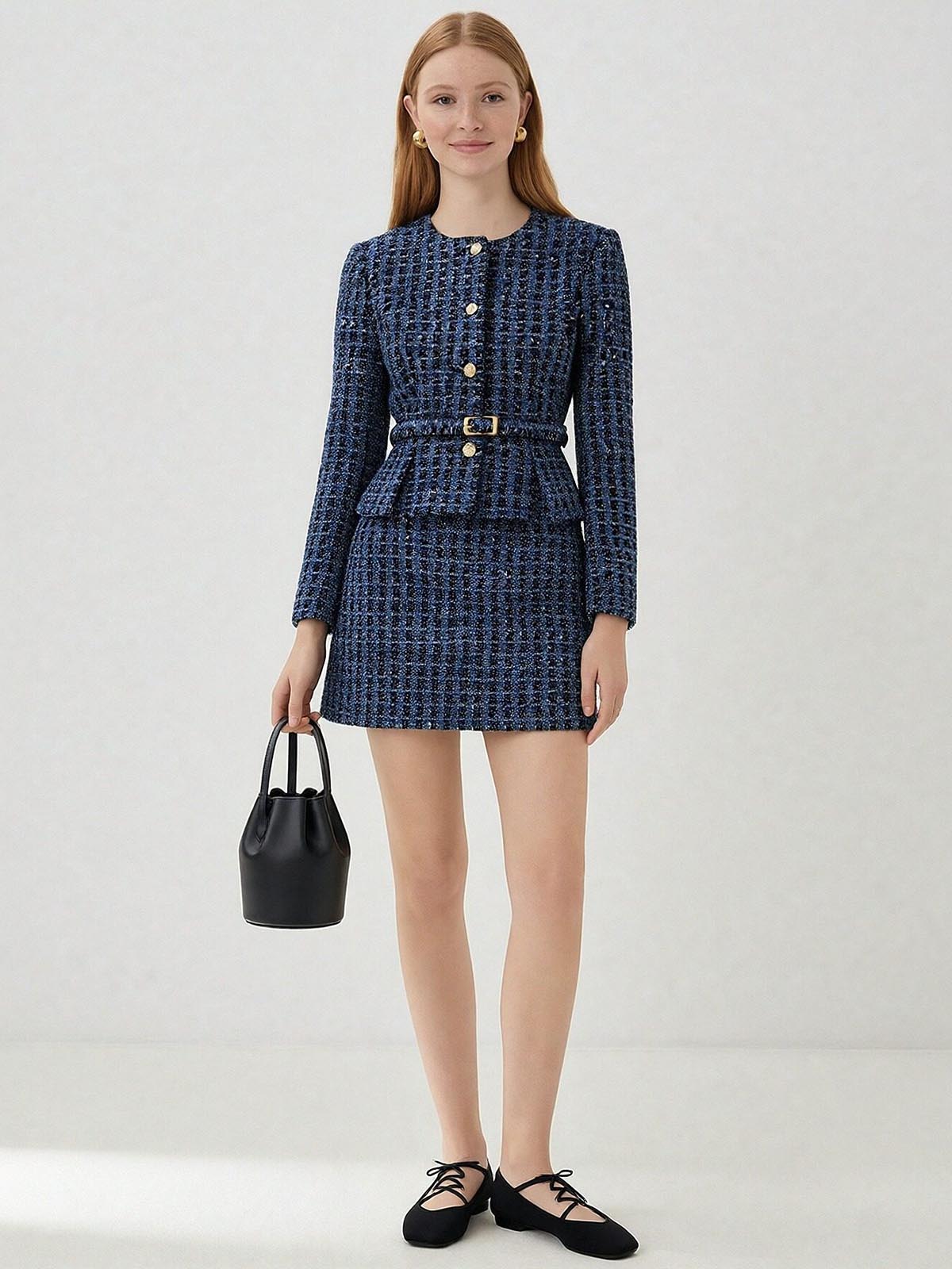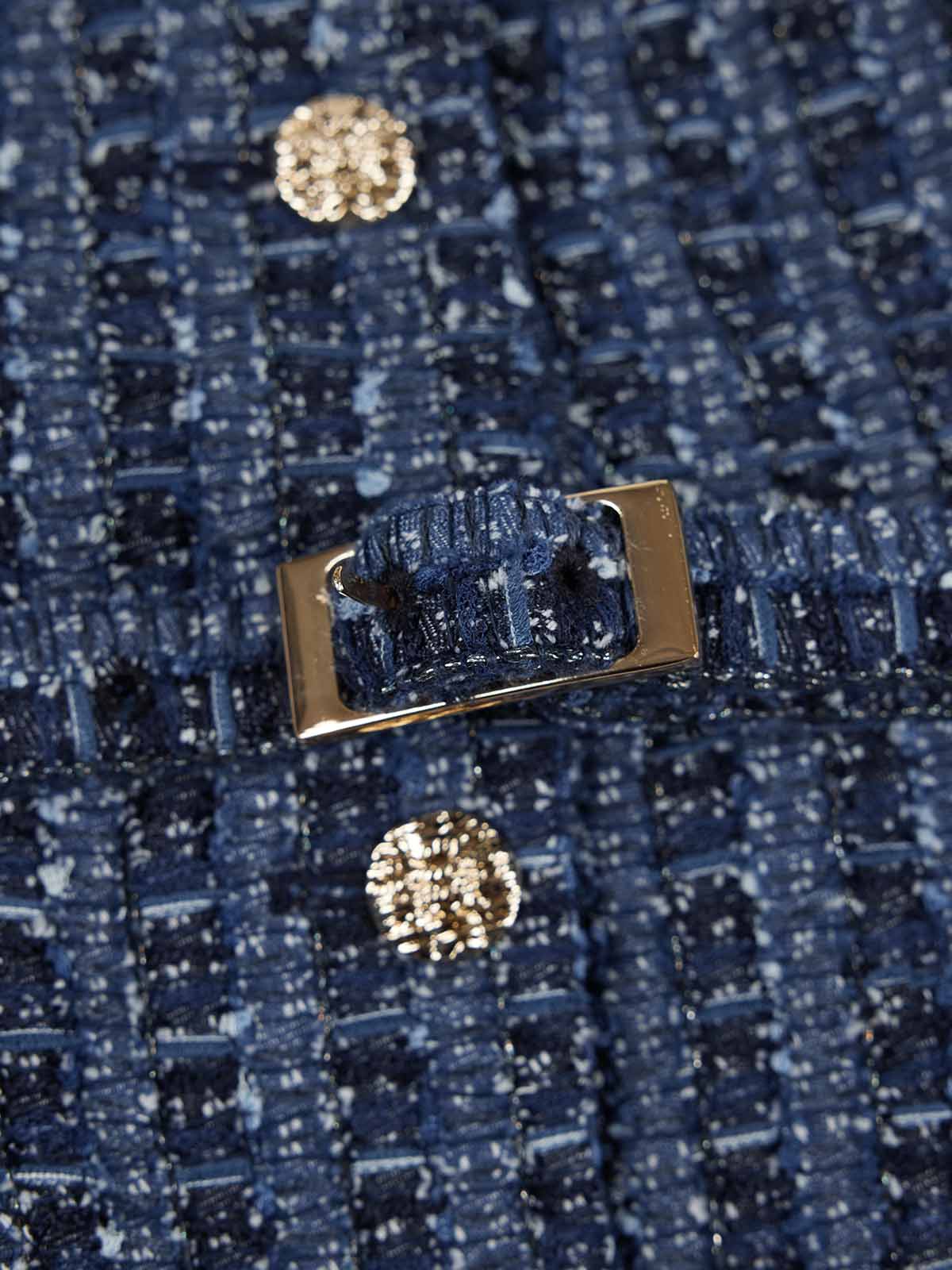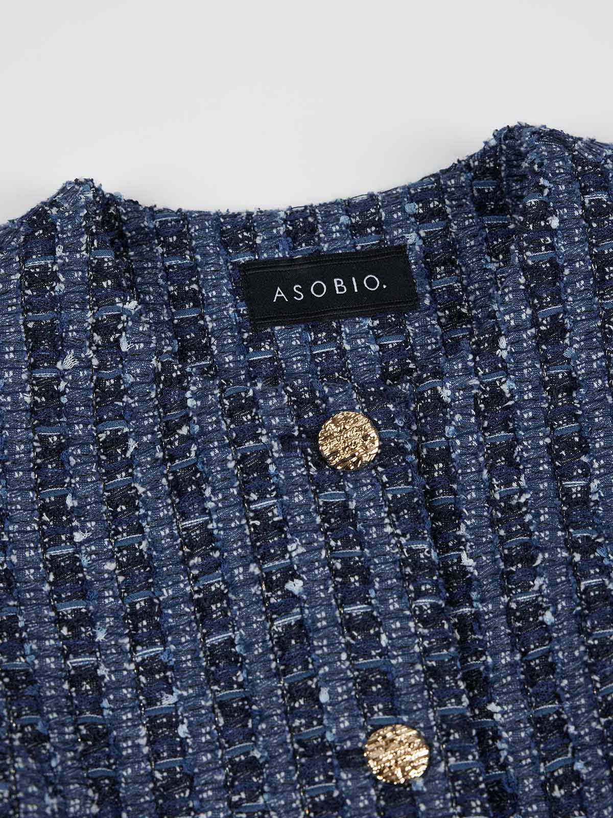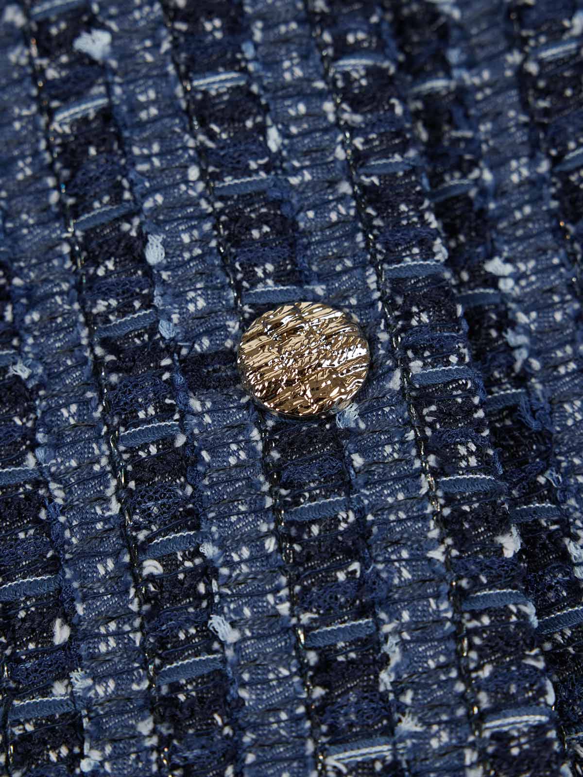 It’s made with a mixed tweed fabric that blends cotton, viscose and recycled polyester with mesh, ribbon yarns and subtle metallic threads for textured dimension.