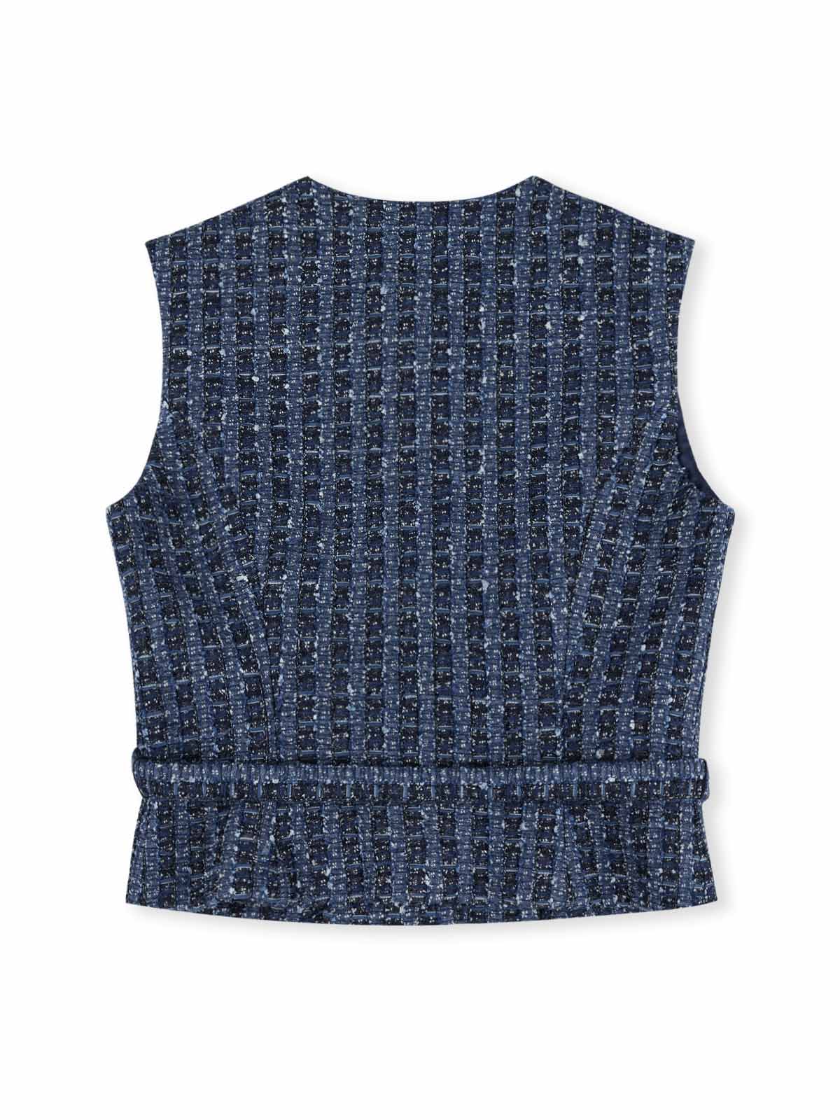 This is a sleeveless tweed vest with a round neckline, metal button closure and a waist belt to define the fit.
