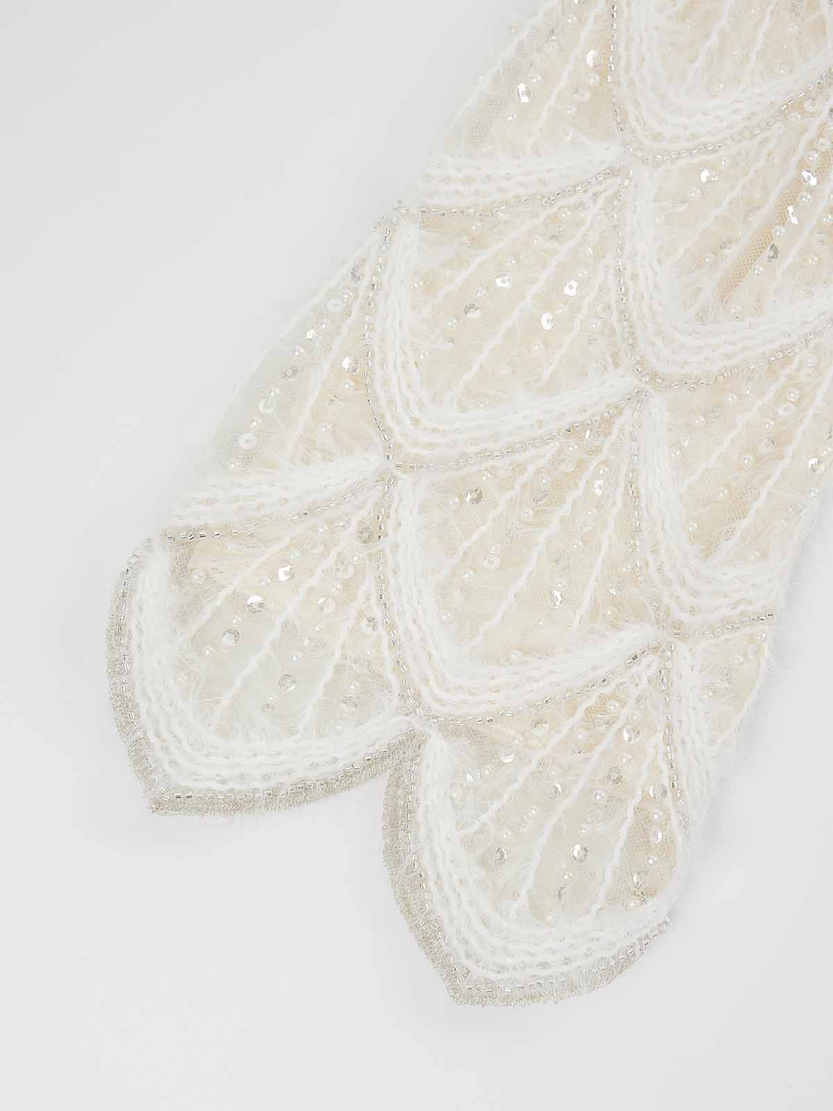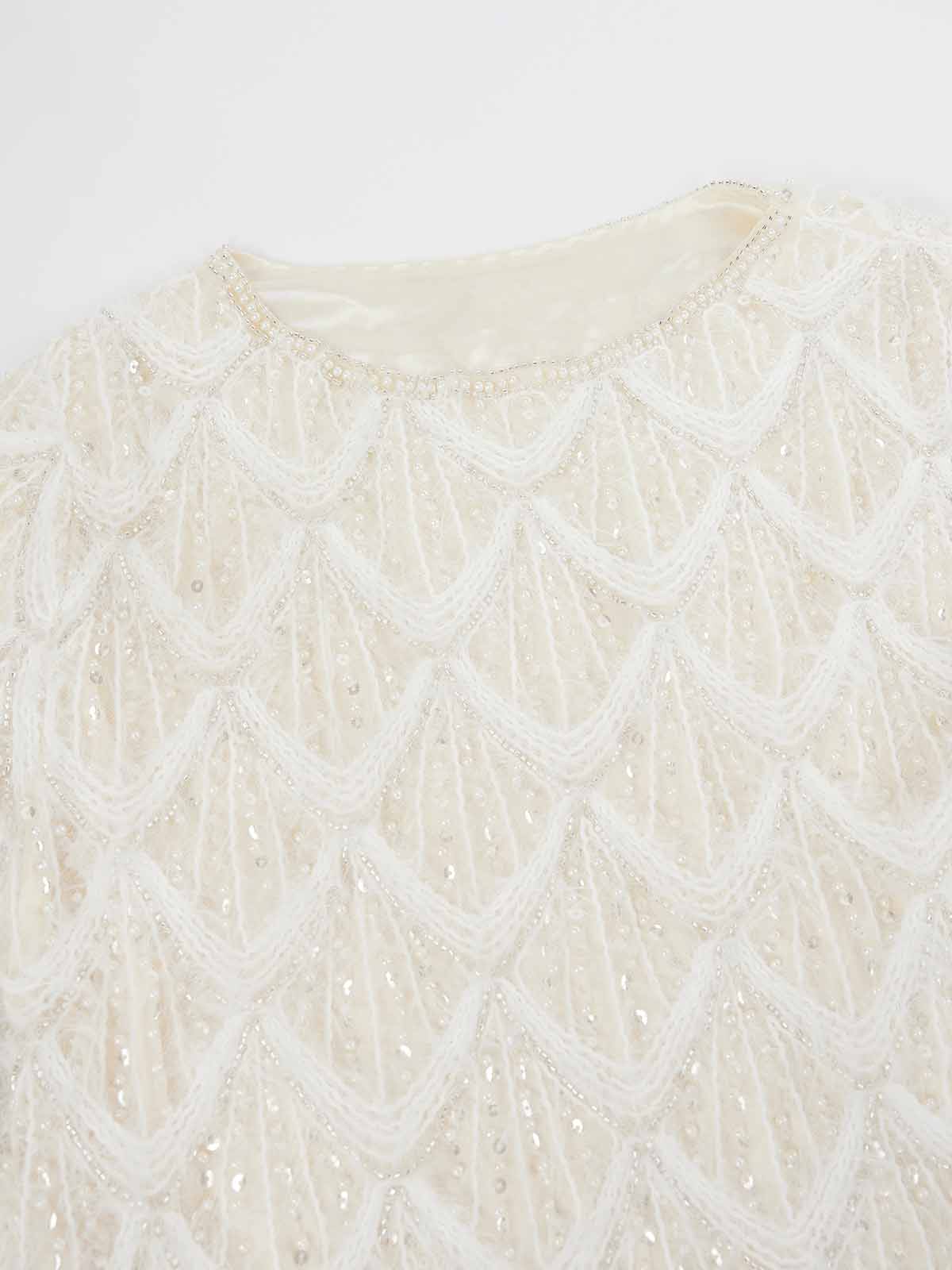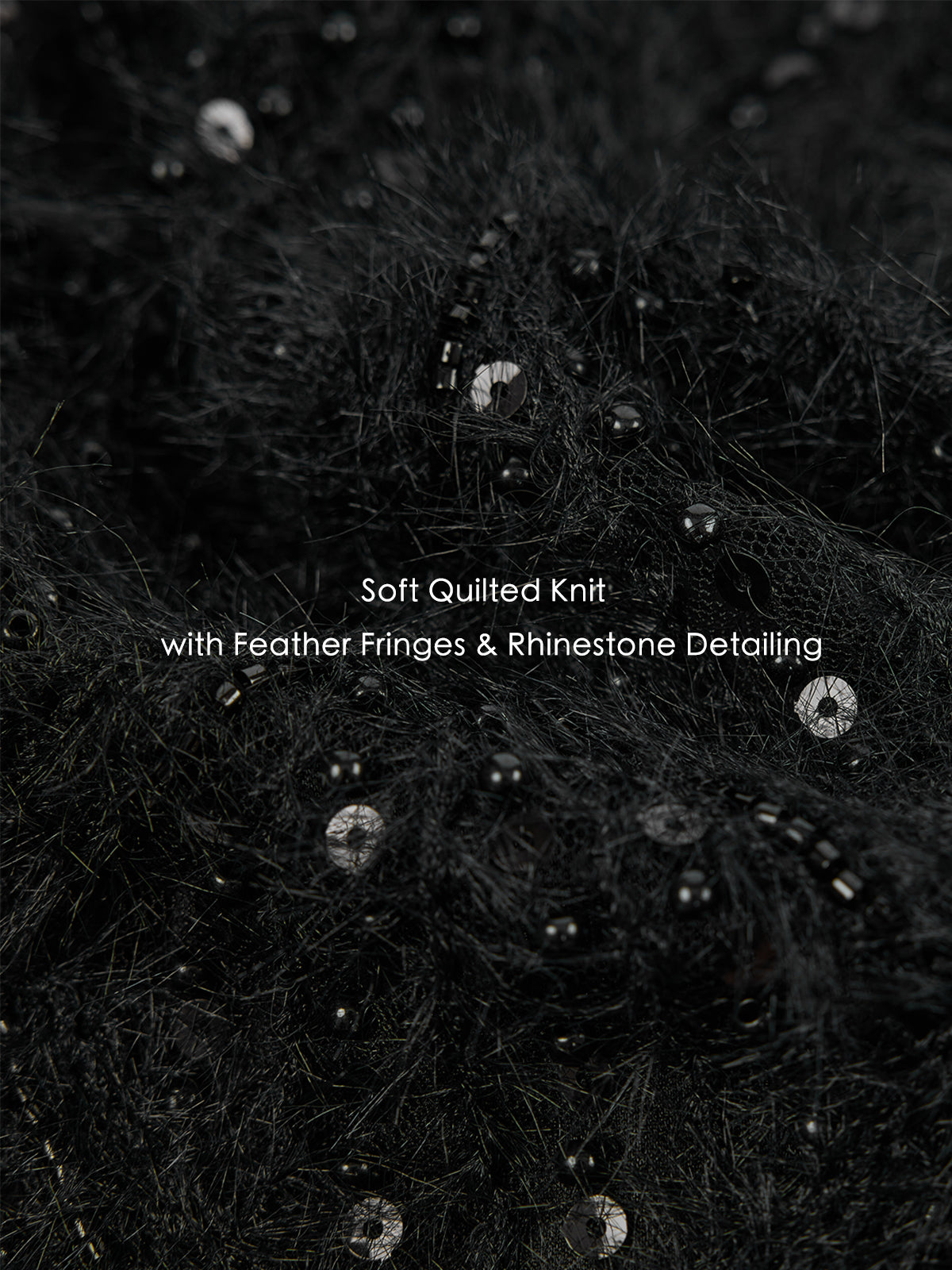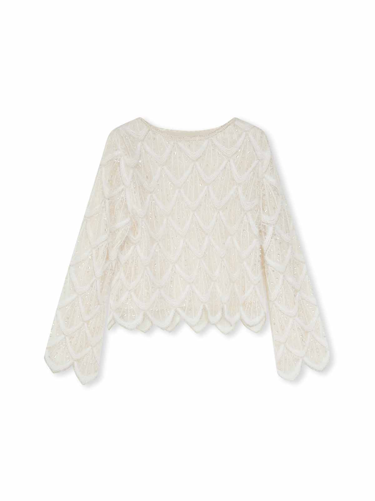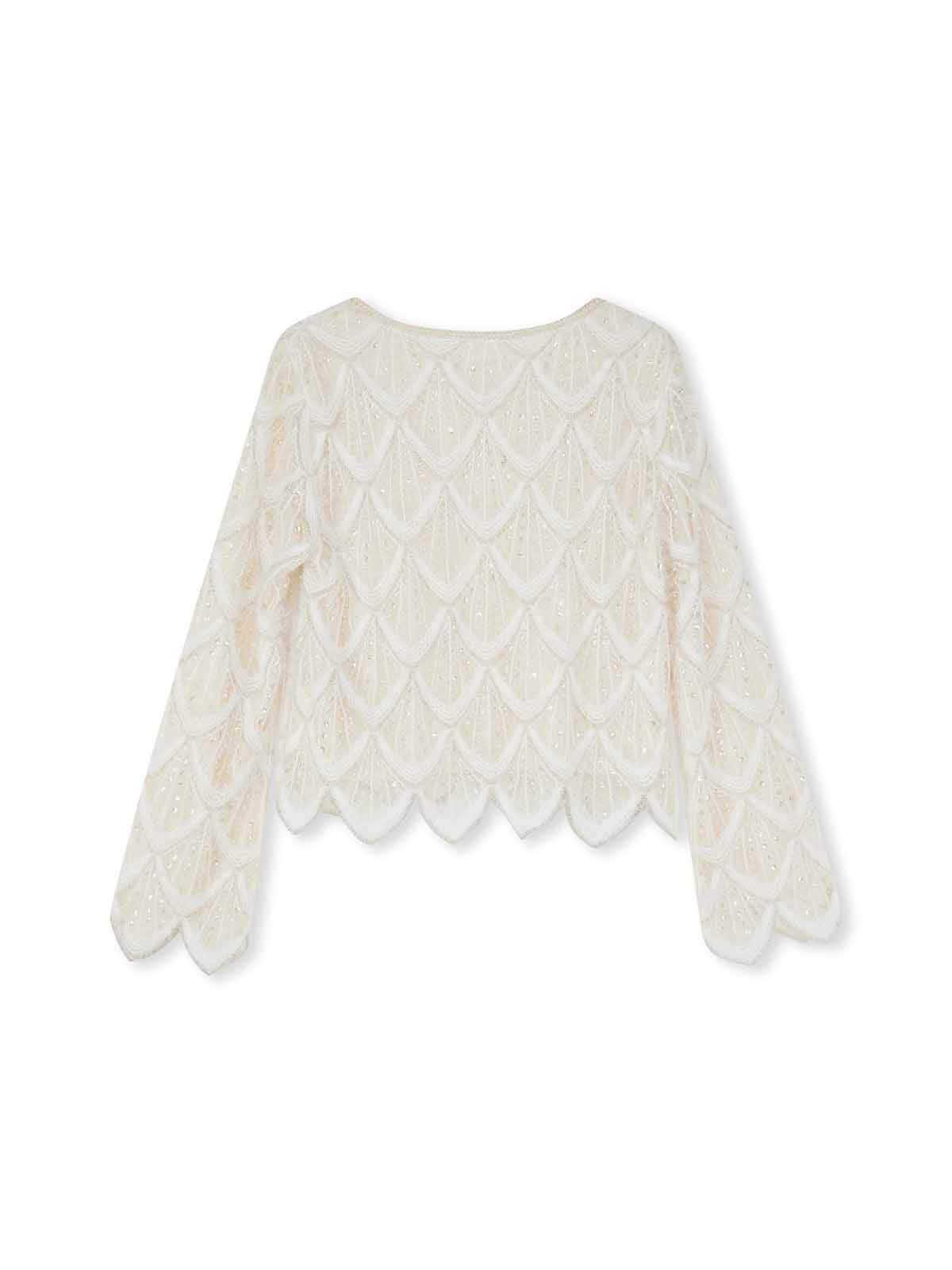 This is a crewneck cropped sweater with wave-edge cuffs and hem. It’s crafted with a diamond-knit texture, feather-trim accents and crystal embellishment for a soft yet dimensional look. The cropped silhouette defines the waist and elongates proportions, while the round neckline layers effortlessly with jewelry.