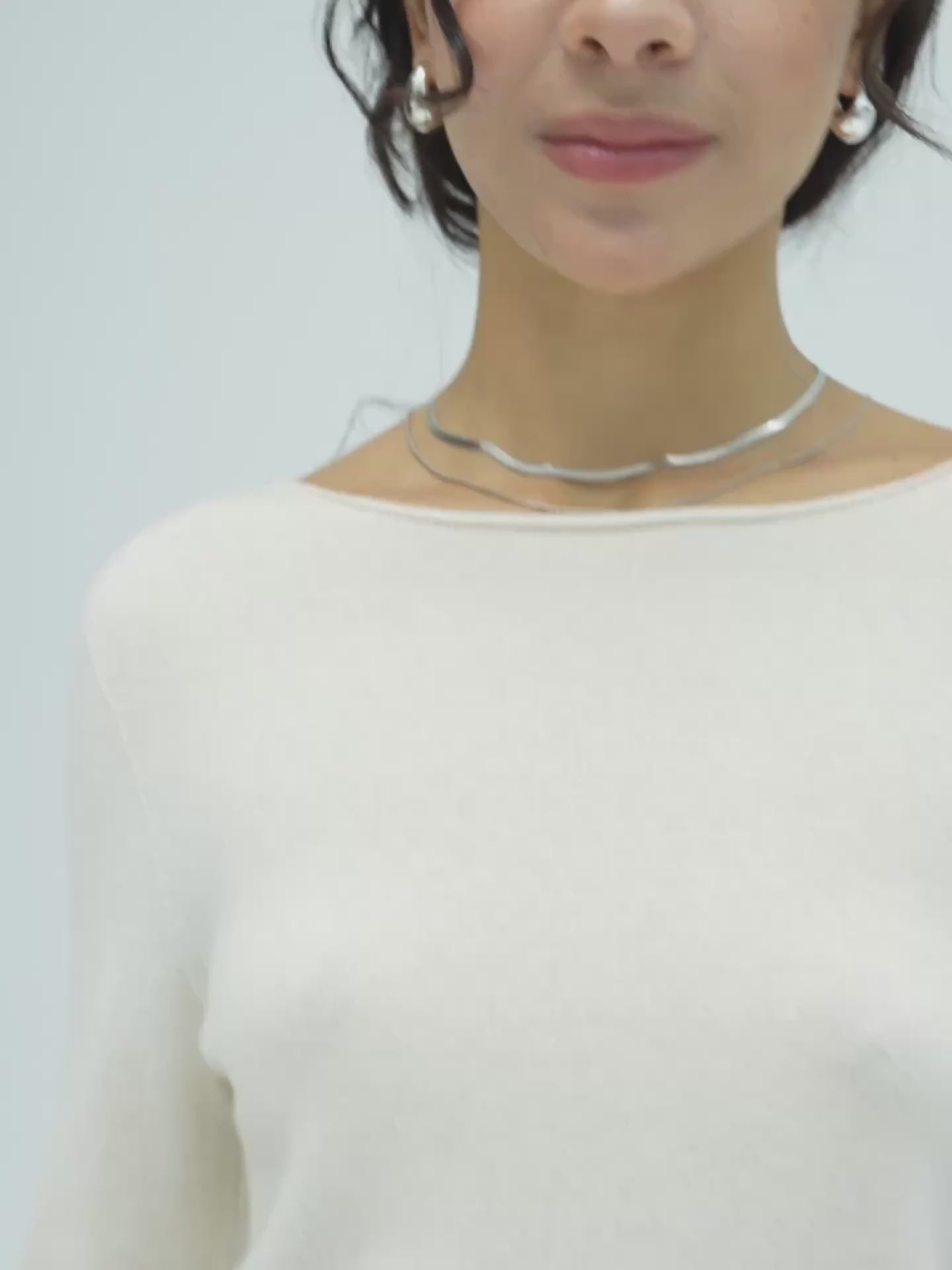 This is a relaxed-fit pullover sweater with a boat neckline. It’s knit from a soft wool-cashmere blend that feels cozy and warm against the skin.
