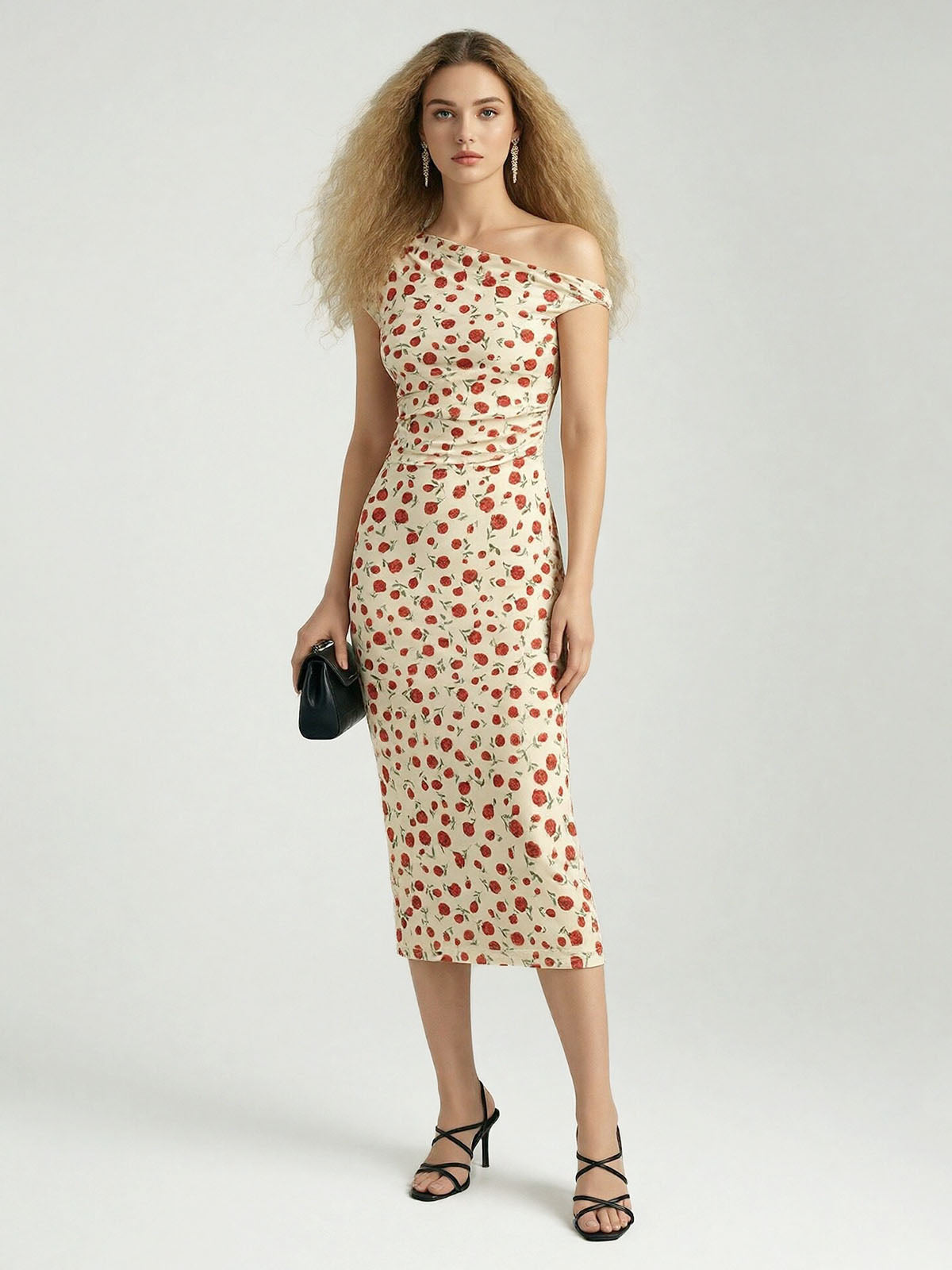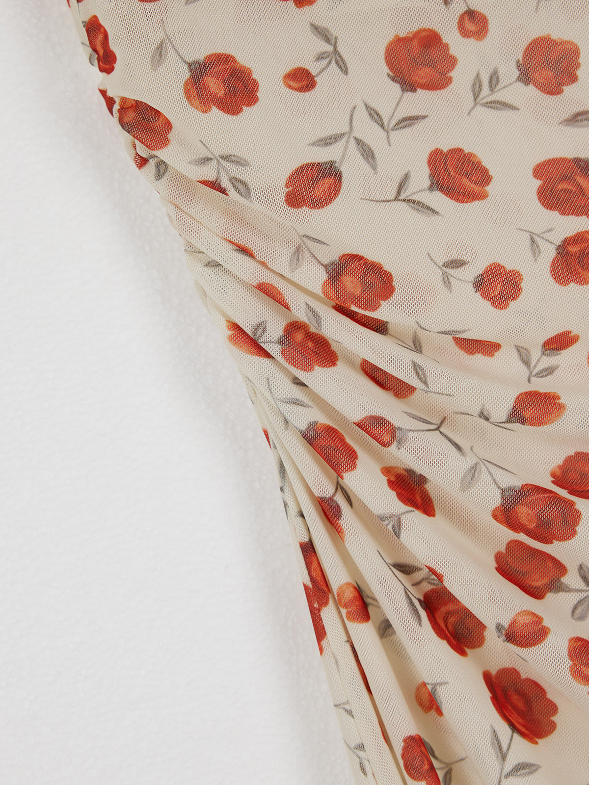 This is a fitted semi-sheer mesh dress with an asymmetrical off-the-shoulder neckline and gentle ruching through the waist.
