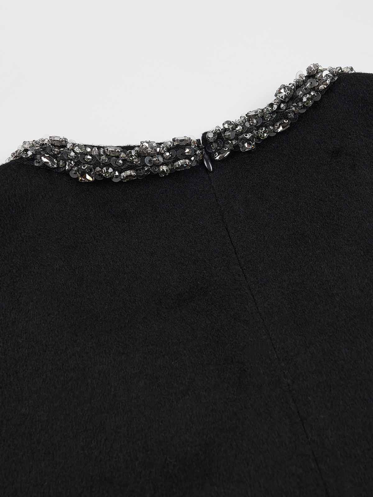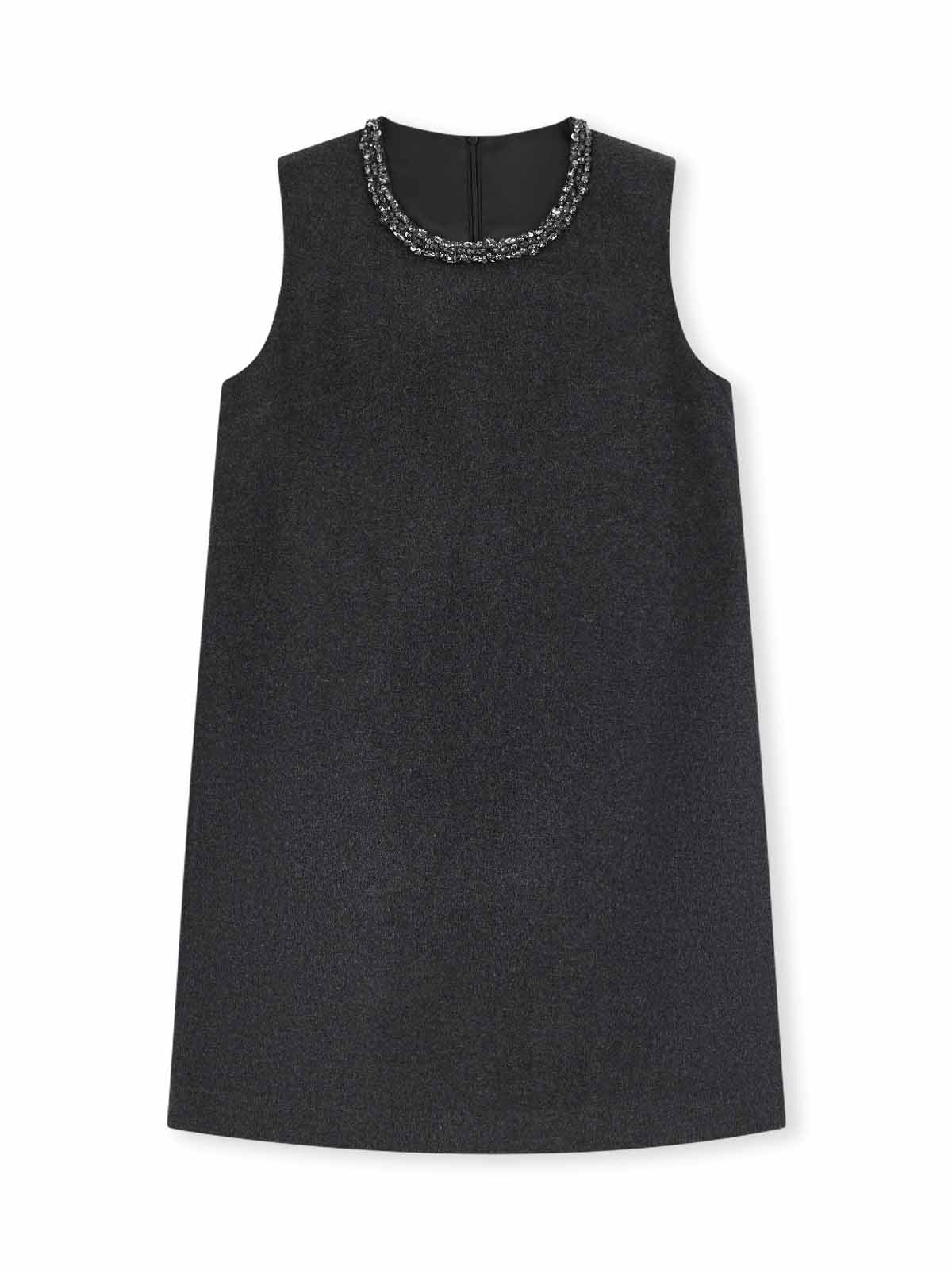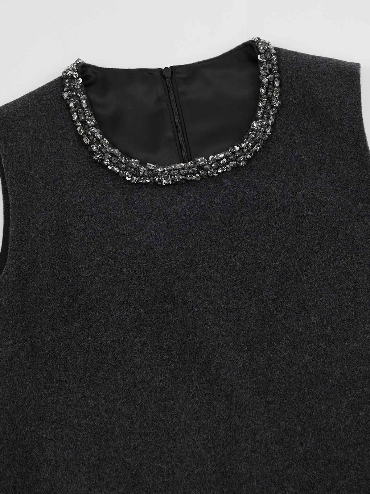 This is a straight-fit sleeveless dress with an elegant beaded neckline and an invisible back zip closure. It’s crafted from a wool-cashmere blend in refined boucle texture, designed to flatter while offering warmth and structure.