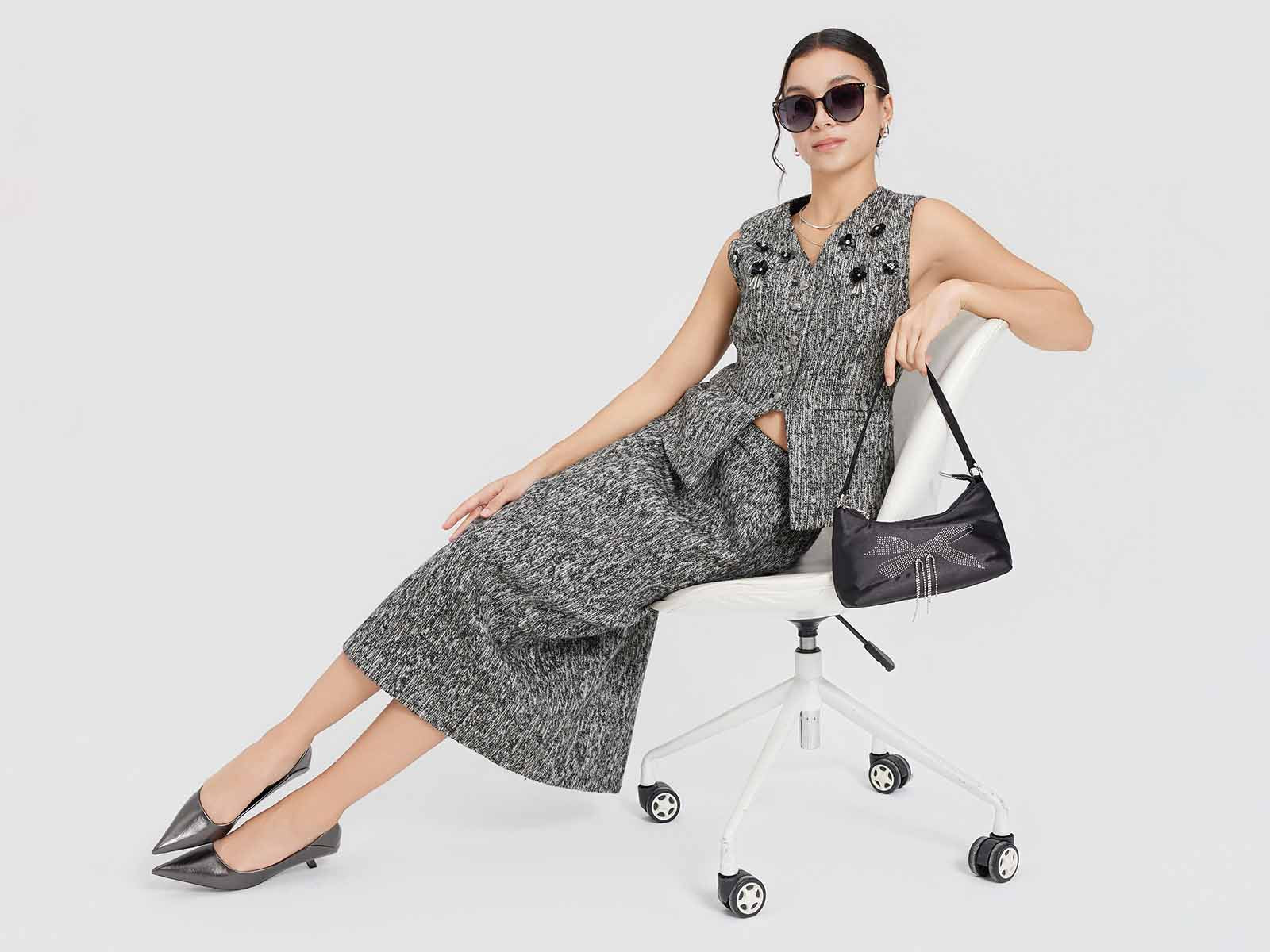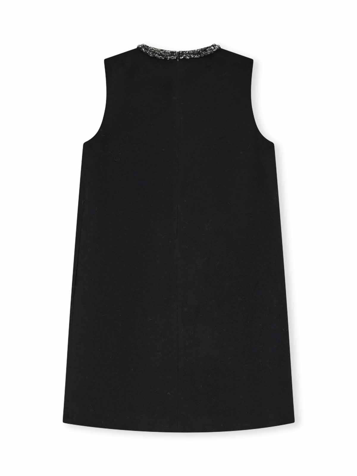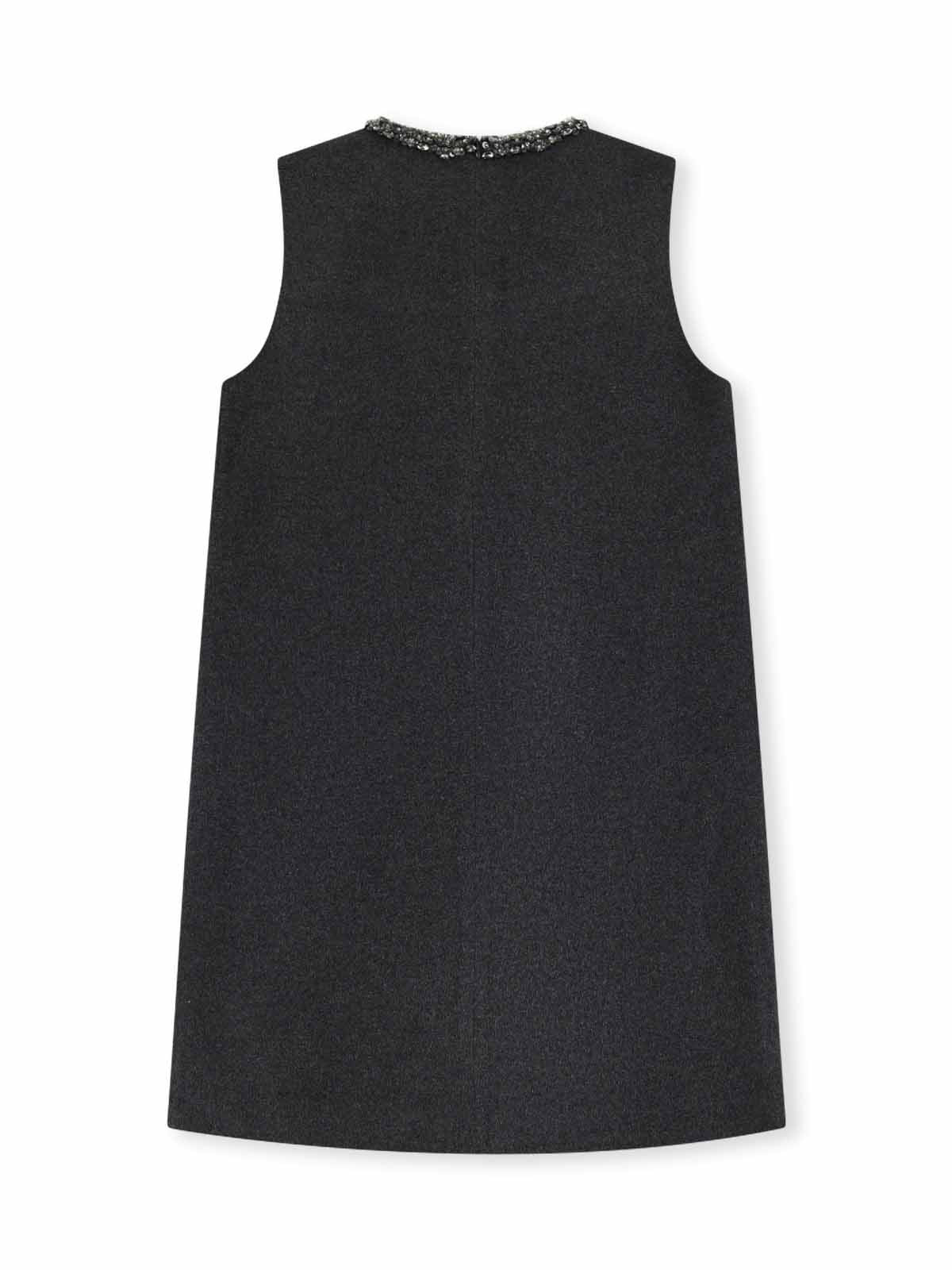 This is a straight-fit sleeveless dress with an elegant beaded neckline and an invisible back zip closure. It’s crafted from a wool-cashmere blend in refined boucle texture, designed to flatter while offering warmth and structure.