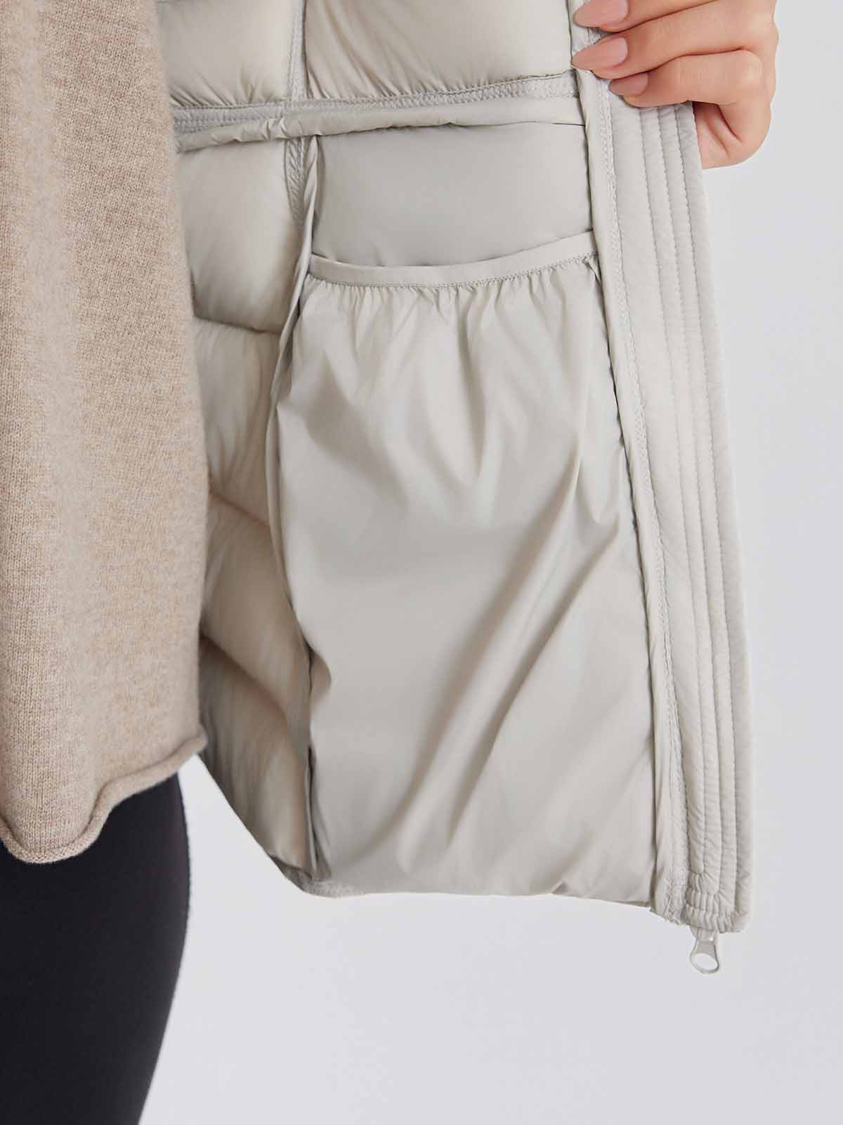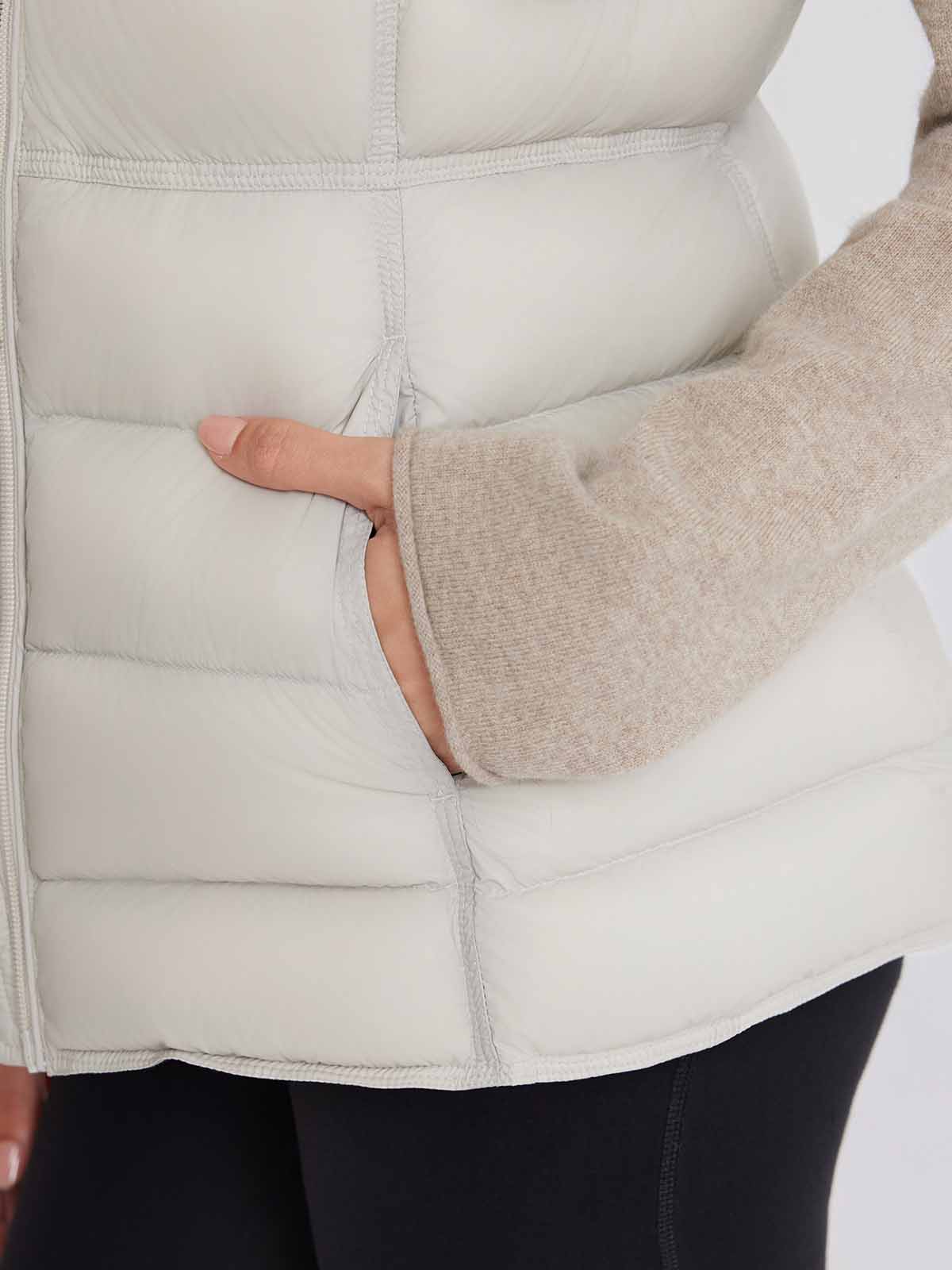 This lightweight hooded vest is filled with premium down for exceptional warmth without bulk. It features a two-way front zipper, side seam pockets, and an adjustable inner drawstring at the waist for a customizable fit. Designed for layering, it delivers a sleek silhouette with a soft, airy feel — perfect for versatile, on-the-go warmth.