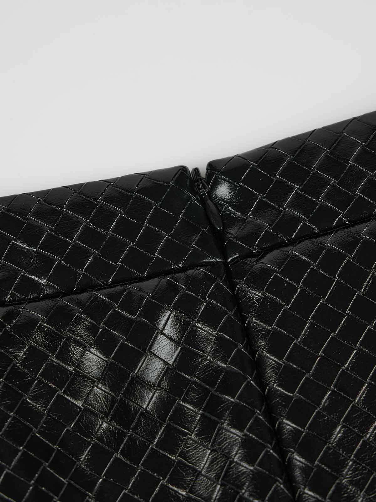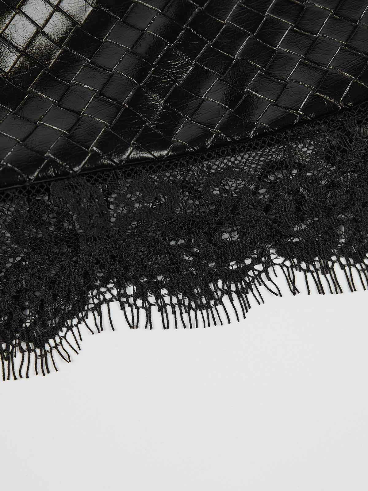 This skirt is made from black PU with a subtle woven-effect texture that adds depth and refinement. Finished with delicate lace trim along the hem, it creates a striking contrast between structured shine and soft femininity. The clean silhouette balances edge and elegance, making it easy to style from day to night.
