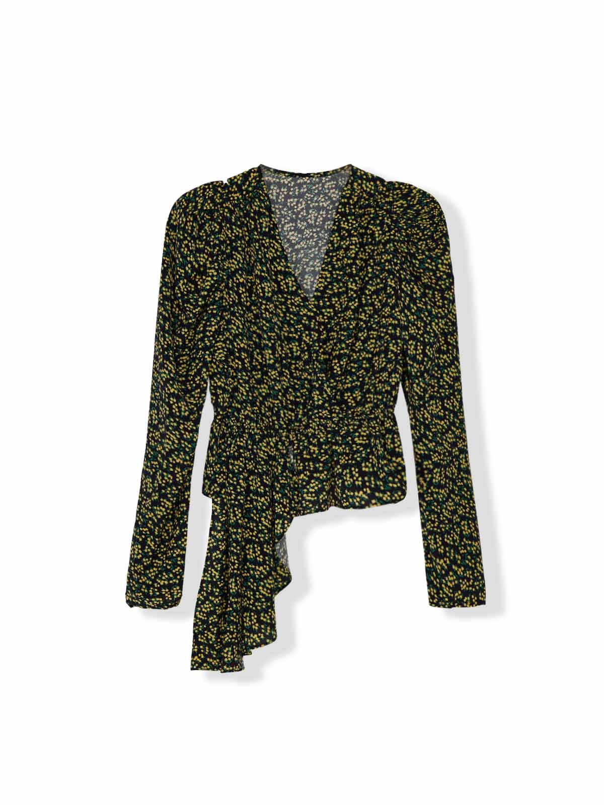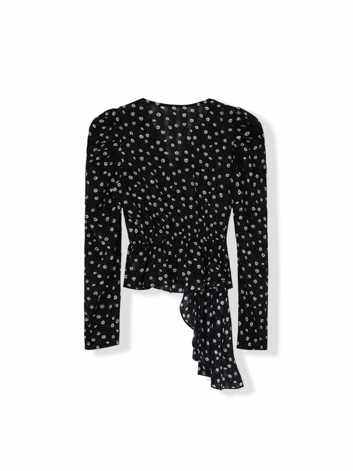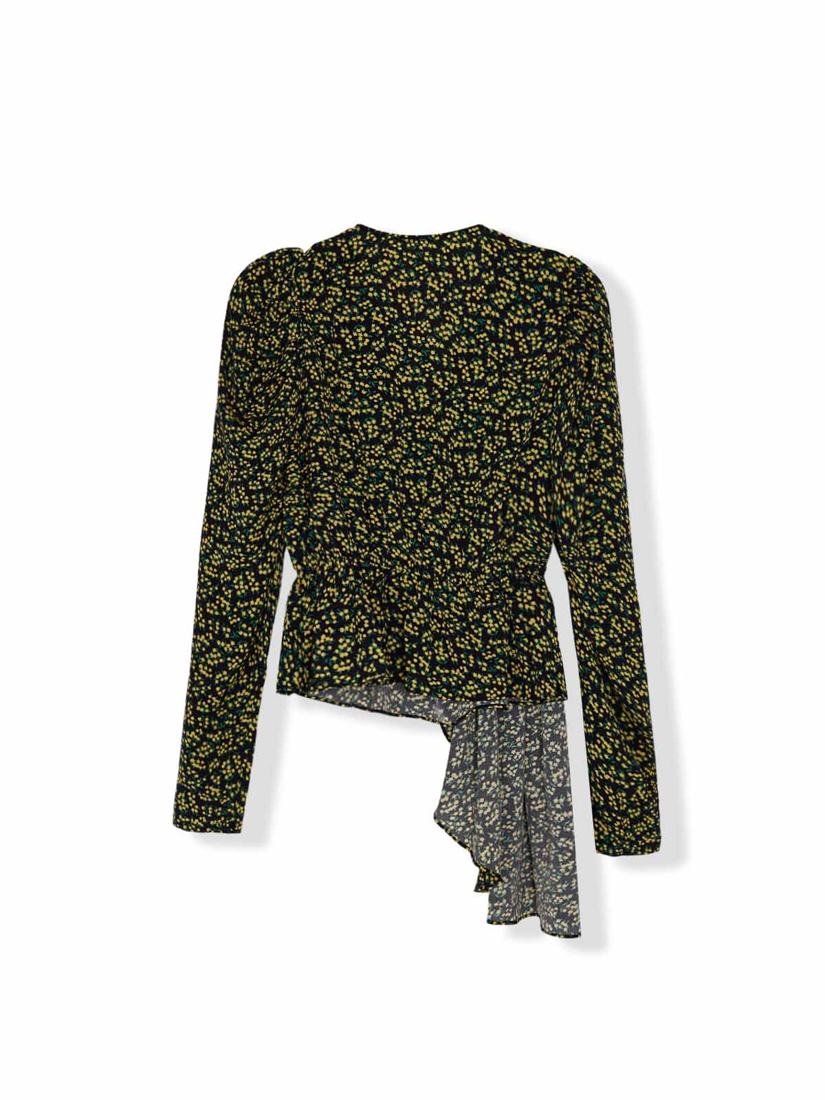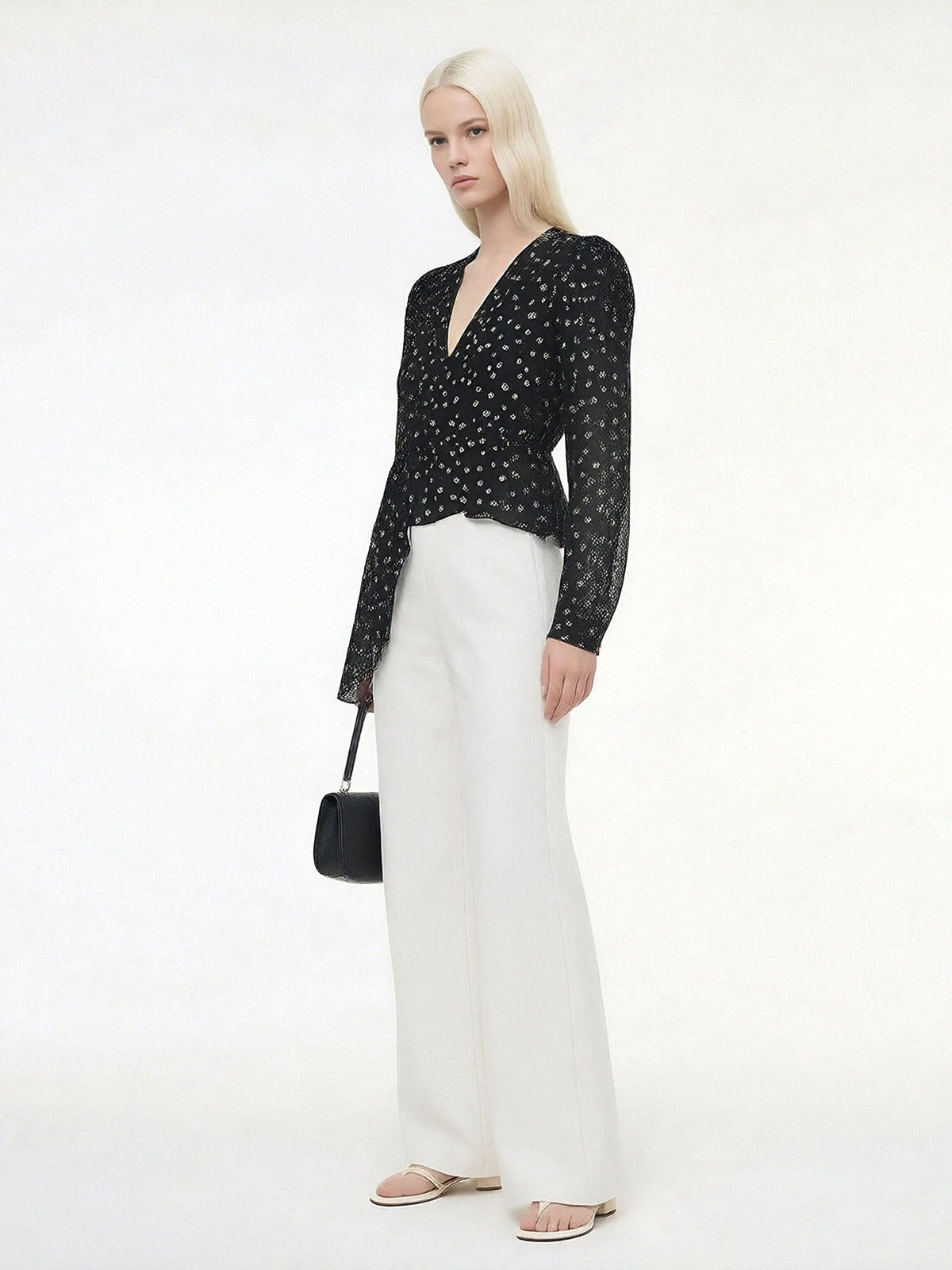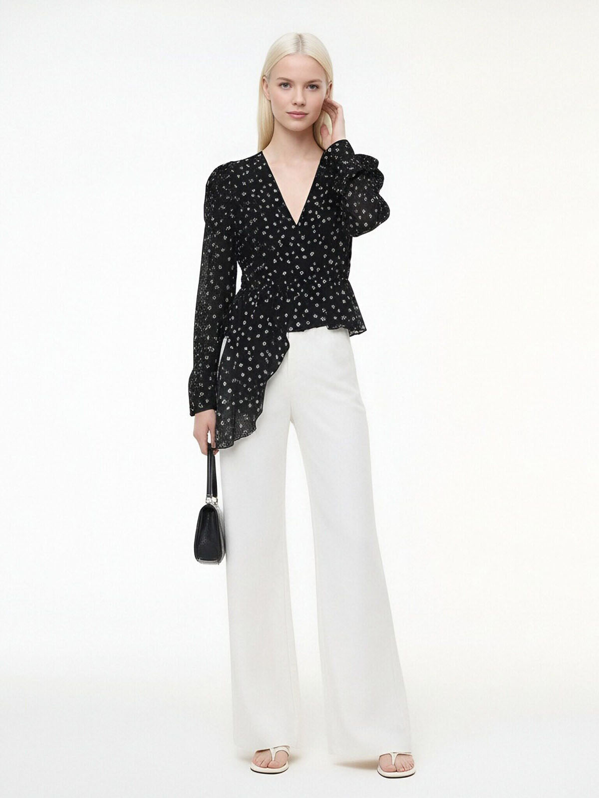 The V-neck blouse features a fitted waist and an asymmetrical hem for a flattering, fluid silhouette that highlights the face and waist.